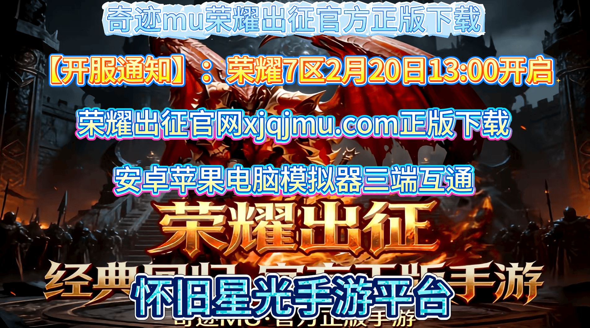 《荣耀出征》是正版端游授权、怀旧星光手游平台宣传的国产移动网络游戏。该游戏申报类别为移动游戏!荣耀出征手游官网(官网地址含xjqjmu核心标识)后续公测运营及资讯公告官网公布!魔幻之风再起,荣耀征程启航!2月20日13:00,《奇迹MU·荣耀出征》【荣耀7区】正式开启,公平起跑线已重置,专属福利已备好,官方唯一下载渠道已开通,静待各位勇士集结!